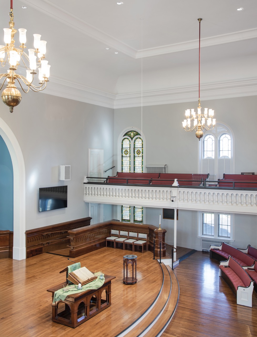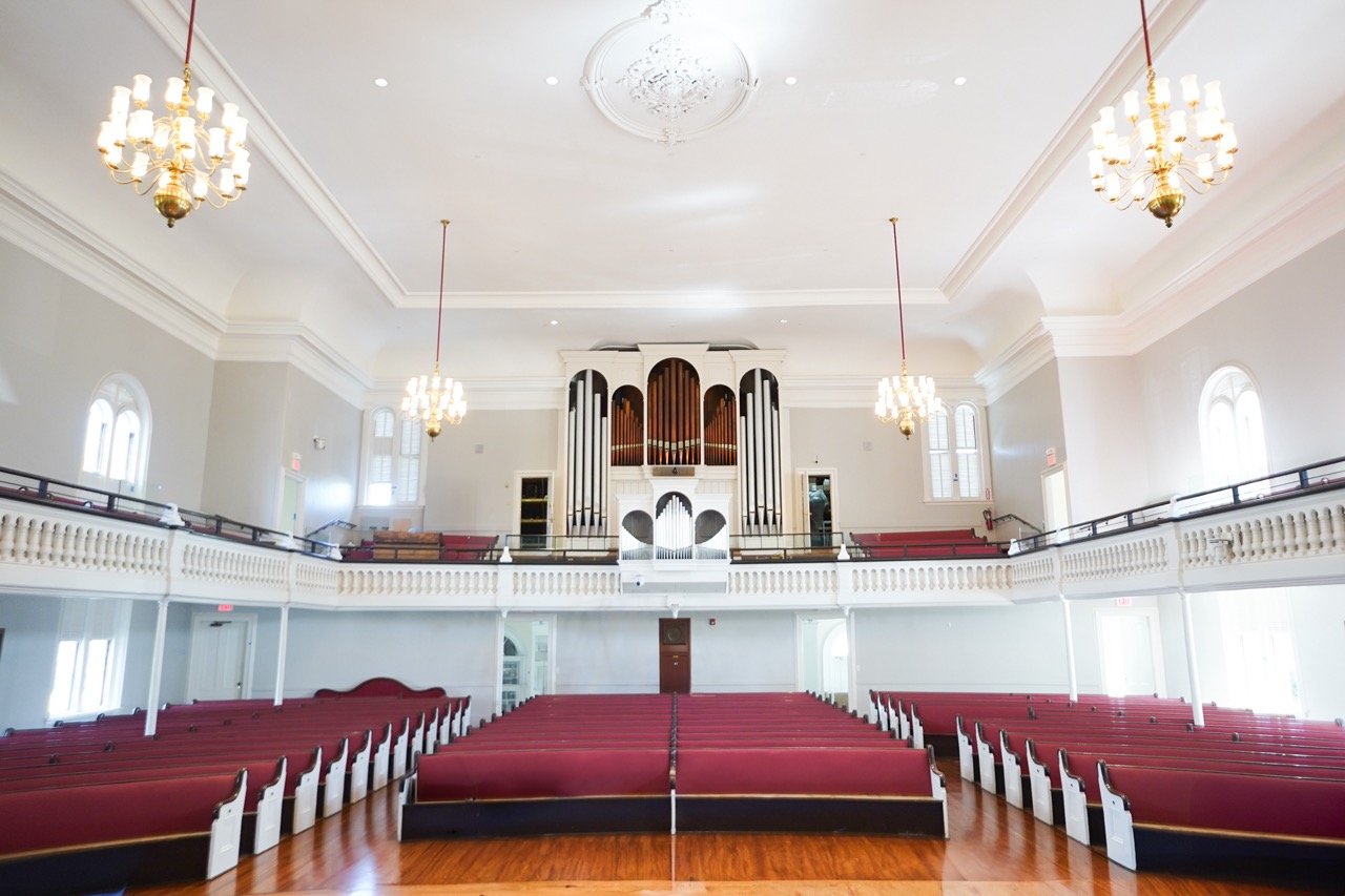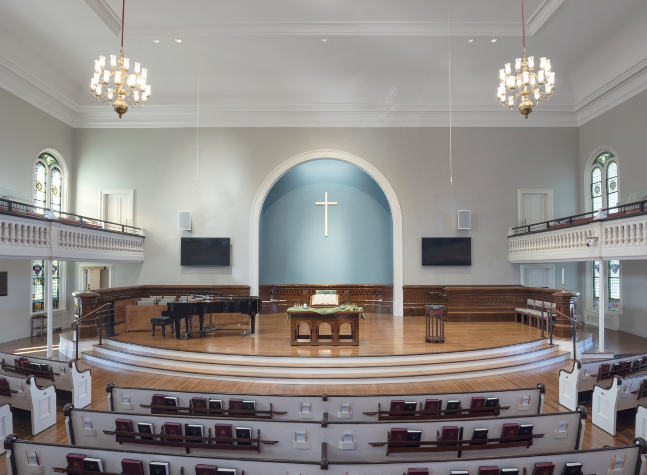 The South Church structure was built in 1860 on the same spot as the original meeting house of 1788. The church, a Romanesque Revival, was designed by John Stevens. As part of the renovation, the sanctuary chancel was reconfigured with an expanded platform to better accommodate program needs and improve accessibility, allowing full participation in worship and musical performances. Updated lighting and acoustic systems were installed to support both in-person and remote services, alongside the restoration of key interior elements and finishes. The project also modernized critical building systems, including structural, fire protection, HVAC, electrical, and plumbing, while incorporating energy-efficient upgrades aligned with the church’s environmental goals.